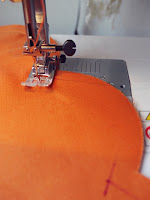 - Put the 3 panelled piece on top of the other, right sides together. Sew along the curved edge. Press seam allowance to one side. Turn right sides out and topstitch along the seamline.